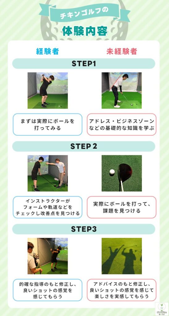 ゴルフ経験の有無や目標・悩みなどを伝え、インストラクターがレッスン内容を組み立て
